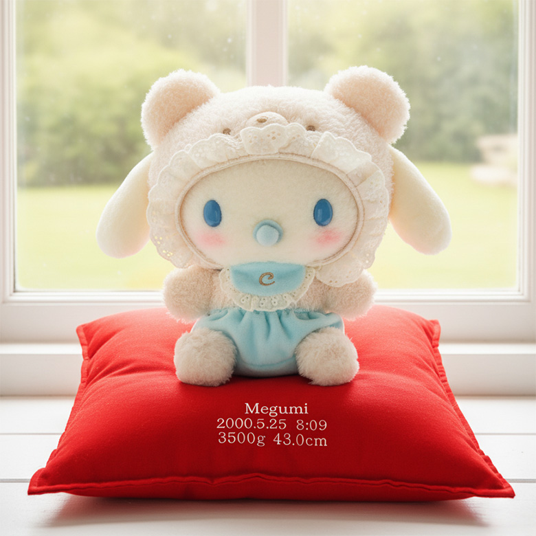 • あなただけの記念日を永遠に刻みます...(ぬいぐるみに足裏が無い場合には、キャラクターにあわせたペンダントなどに刺繍いたします)