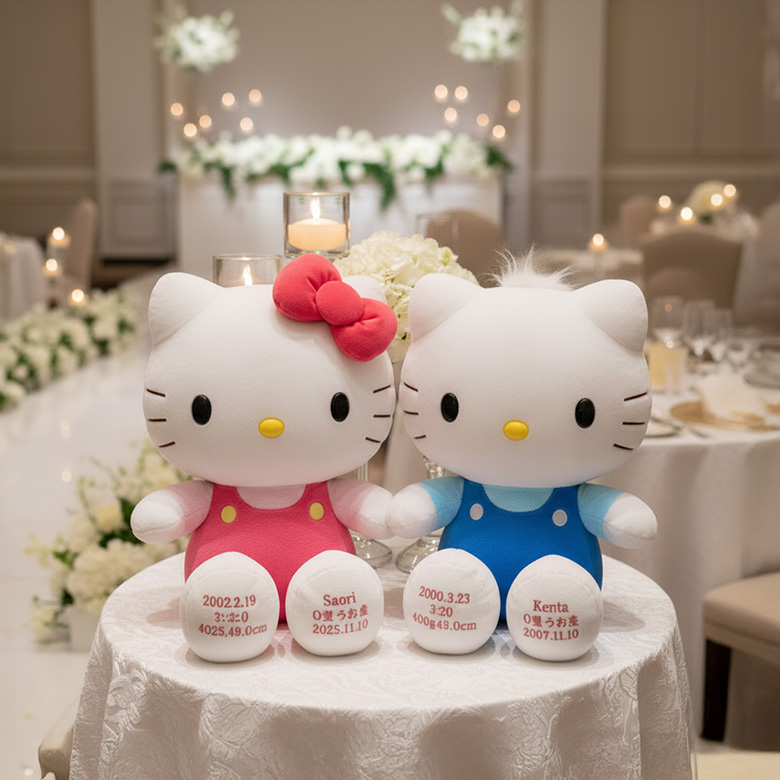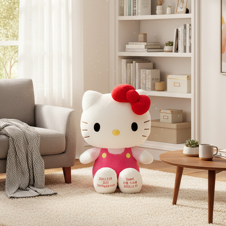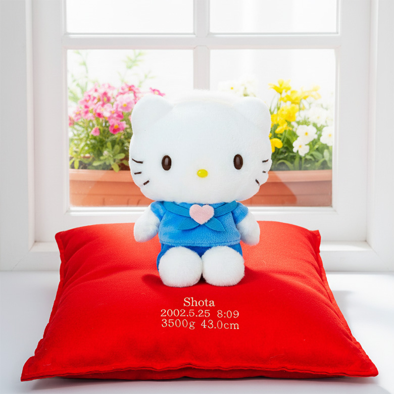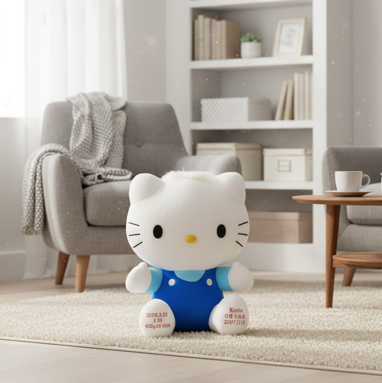 大切にされているハローキティのぬいぐるみを当店にお持ち込みいただき、生まれた時の体重に合わせて丁寧に調整いたします。世界中で愛されるハローキティの愛らしい姿はそのままに、生まれた時の重みを実感できる特別なドールとして、ご家族の宝物となるでしょう。