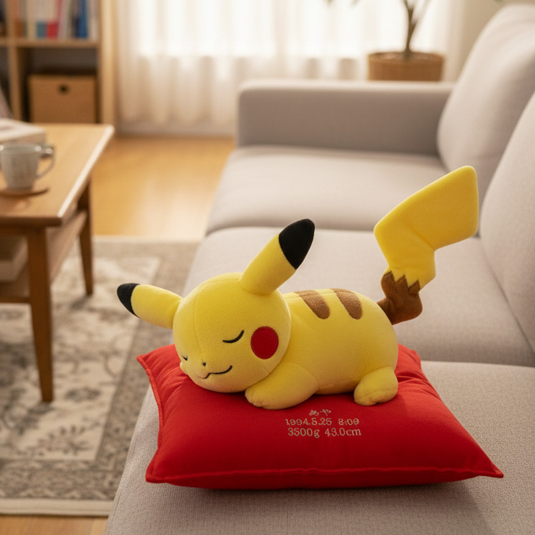 ポケモンが大好きなお客様から、『このぬいぐるみでウェイトドールを作りたい!』というご依頼を多くいただいております。ピカチュウやイーブイ、カビゴン、エルフーンなど、思い出のキャラクターぬいぐるみをそのまま活かせるのがオリジナルウェイトドールの魅力です。