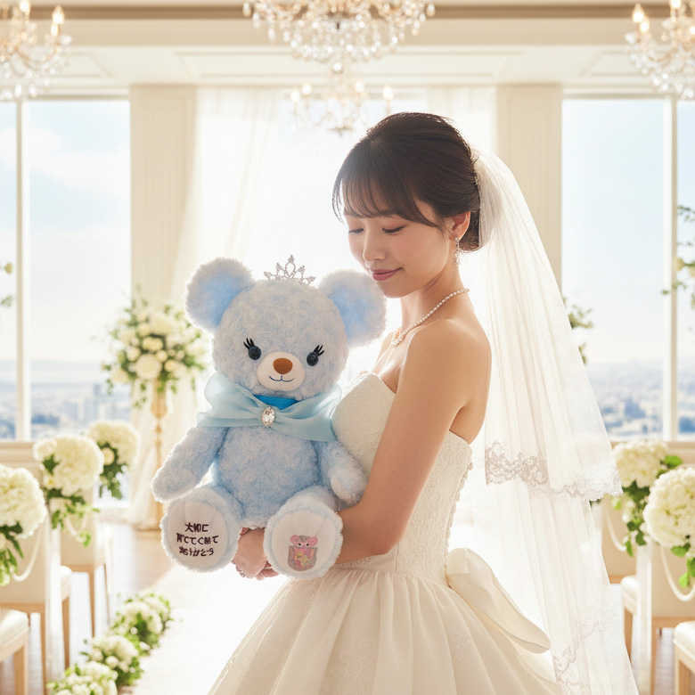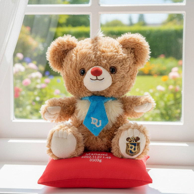 出産祝いやお誕生日、結婚式や成人式での特別なギフトとして、心を込めてお仕立ていたします。仕上がりの重さや刺繍内容など、細かなご希望も丁寧に伺いますので、どうぞお気軽にご相談ください。愛しいユニベアとの絆が、永遠の宝物となりますように。