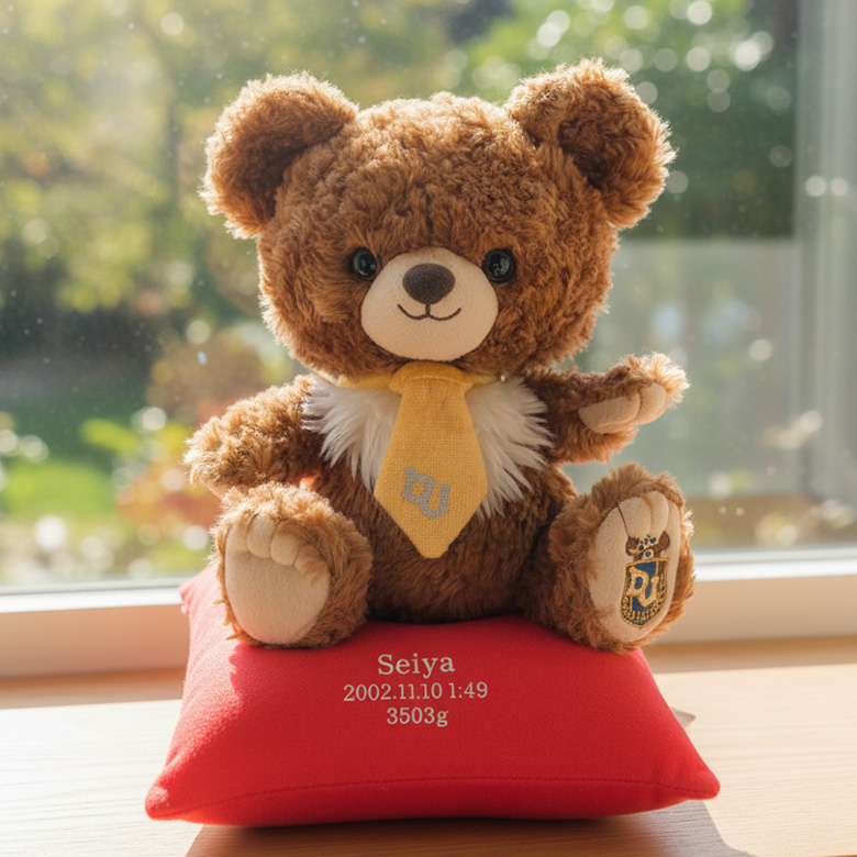 お手元にあるユニベアシティのぬいぐるみを、誕生時の感動的な体重を再現した特別なウェイトドールにお仕立ていたします。